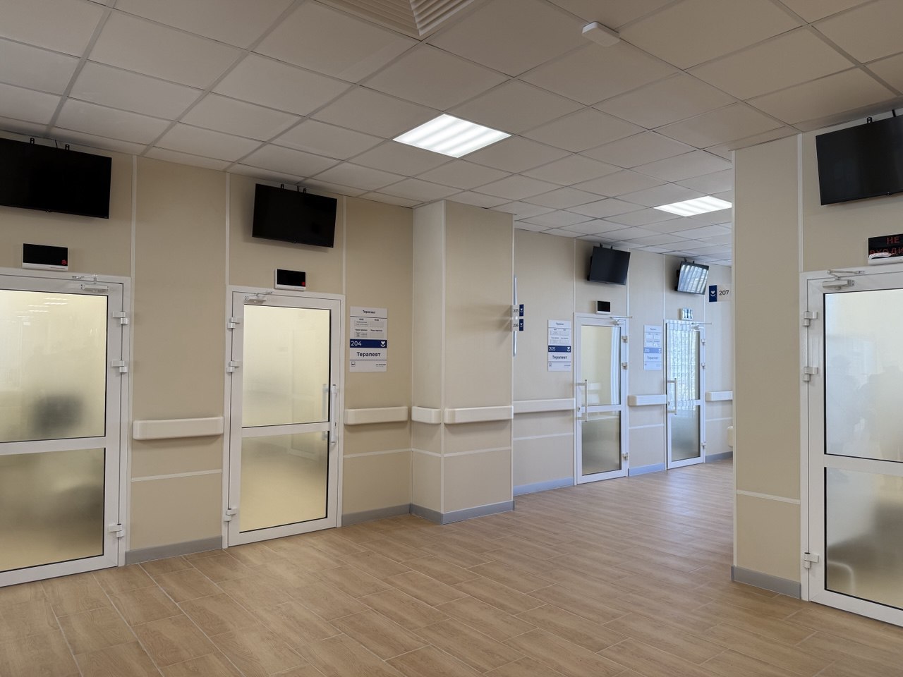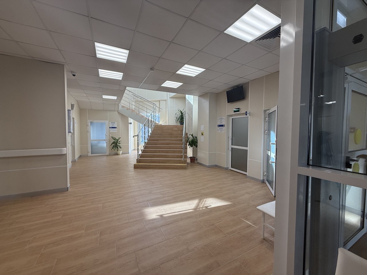 В советское время террасы-соляриумы были не только в санаториях-дворцах, но и в других социальных учреждениях. Вот и у нас в Севастополе теперь есть поликлиника с открытым пространством. Выходы на террасу расположены на 3 этаже, рядом с дневным стационаром (три палаты на 20 коек) и отделением лечебной физкультуры (не успела заглянуть, но еще придет когда-нибудь мое время). Так что у пациентов этих отделений будут условия для занятий на свежем воздухе. На втором этаже - множество кабинетов для терапевтов и специалистов, и тут же - дополнительная стойка регистратуры. На табличках кабинетов уже есть фамилии врачей - надо как-нибудь сходить, проверить зрение.