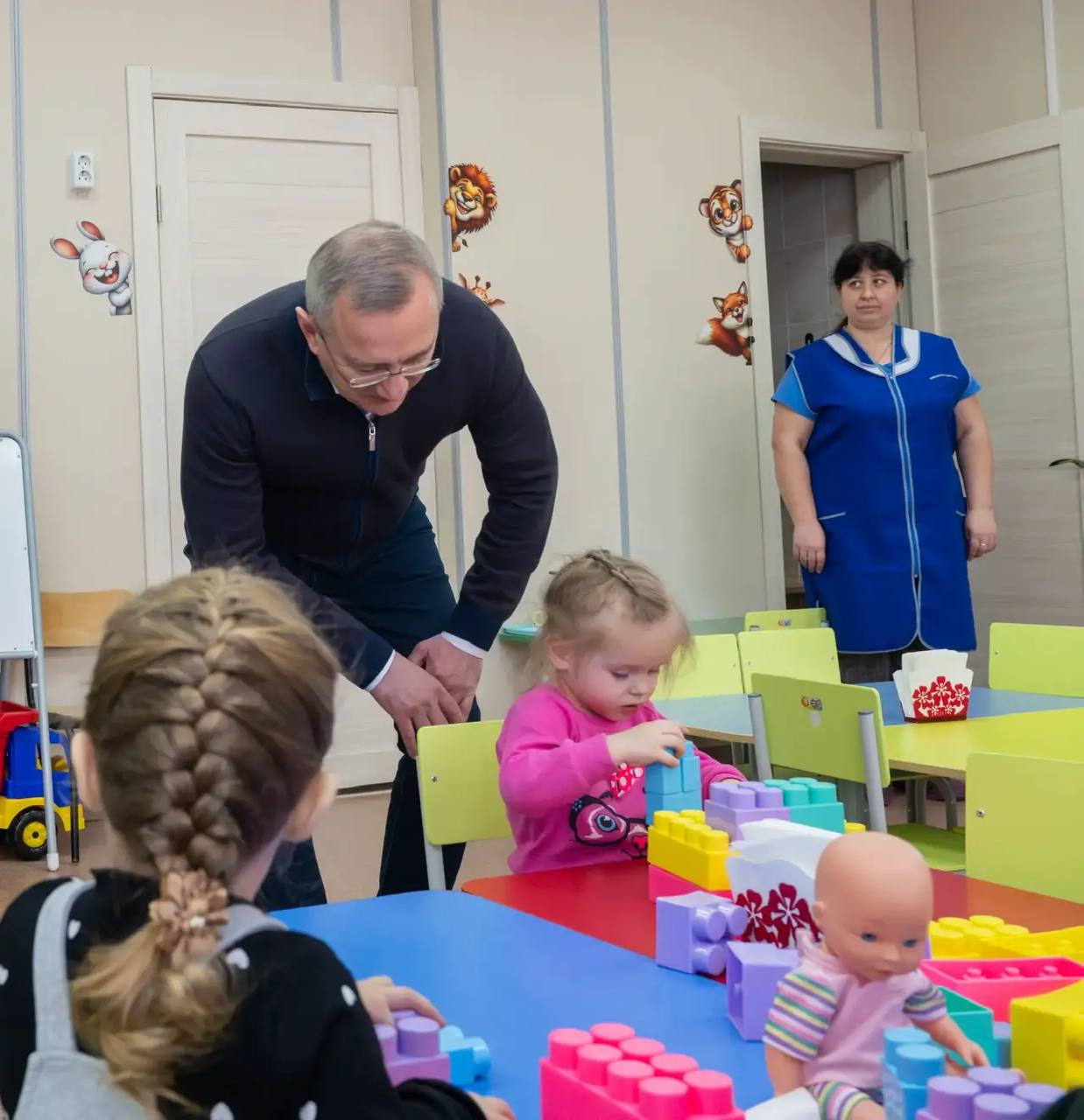Поручил проработать с местными предприятиями АПК возможность поставки молочной продукции в садик. А также открытия здесь агрогруппы. Соответствующая атмосфера уже создана: на стенах не только герои мультиков, но красочные картинки фруктов и овощей.