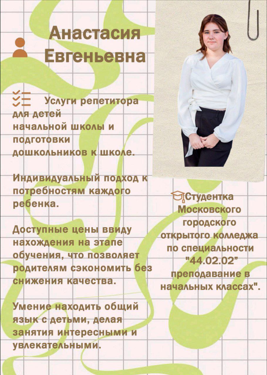 Меня зовут Анастасия, я студентка Московского городского открытого колледжа, на специальности "Преподавание в начальных классах"