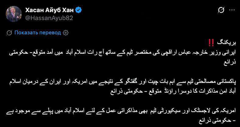 Делегация США отправилась в Пакистан на переговоры, однако Иран сообщил, что они не имеют к этому отношения, так как не намерены вести переговоры до снятия блокады.