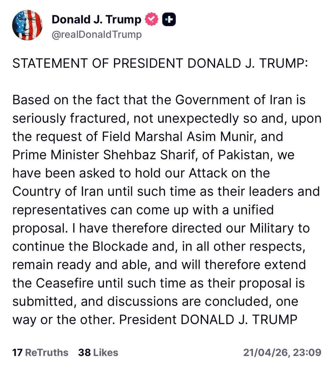 В заключительной части послания Абдуллахи заявил, что Вооружённые силы Ирана не позволят искажать ситуацию на поле боя, в том числе в вопросе контроля над Ормузским проливом, и на любое нарушение обязательств будет дан соответствующий ответ.