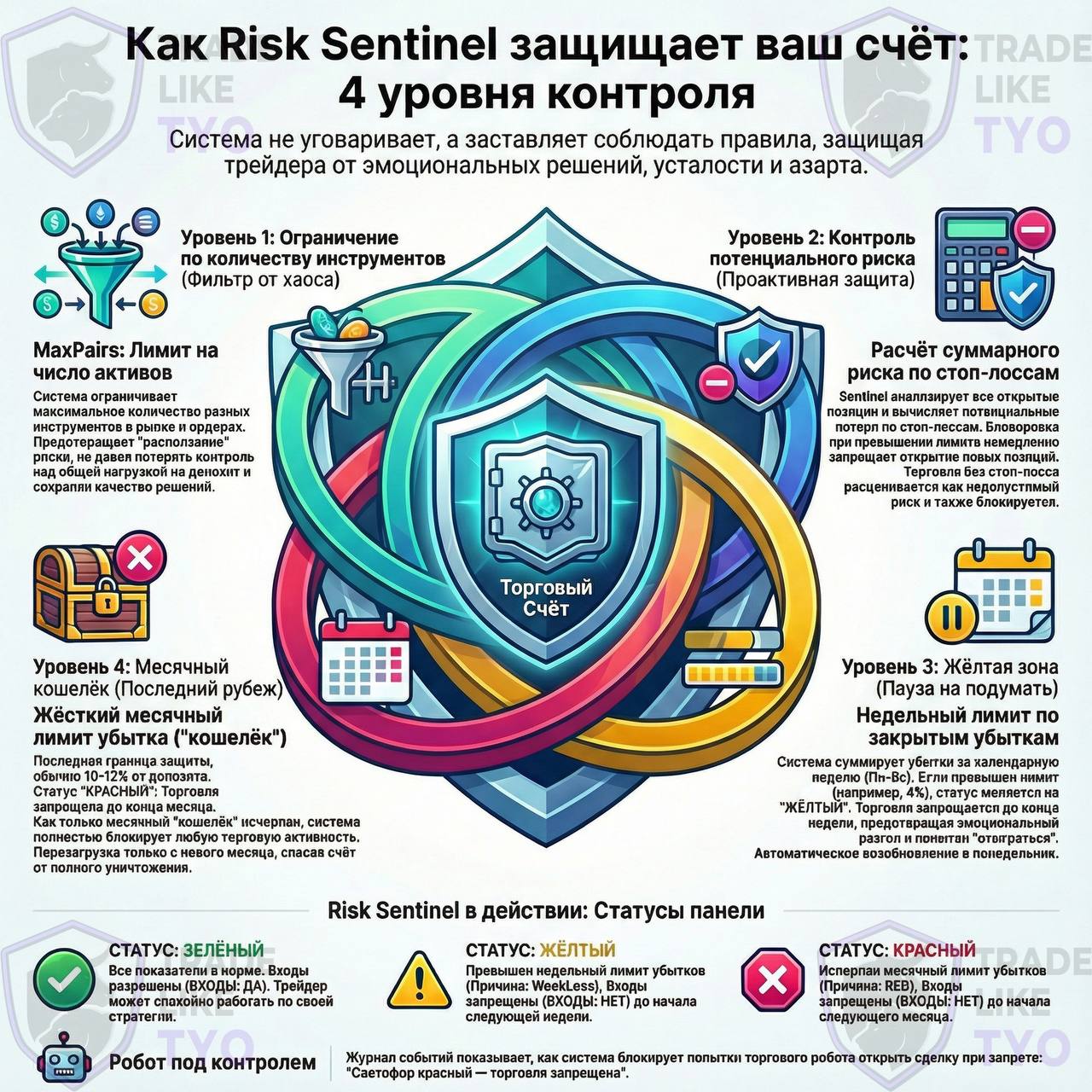Внутри четыре уровня защиты. Сначала ограничение по количеству инструментов. Потом контроль потенциального убытка по стоп-лоссам. Дальше жёлтая зона. Пауза на неделю, если рынок и вы не в форме. И последний рубеж — месячный кошелёк. Жёсткий стоп до следующего месяца.