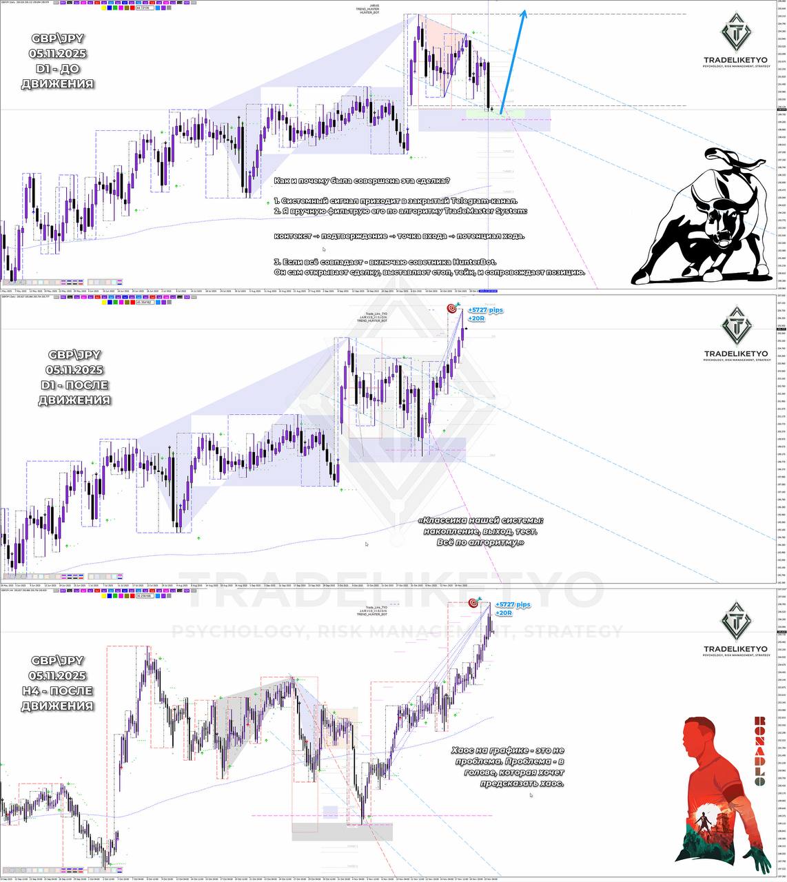 Сегодня пересматривал сделку GBPJPY от 5 ноября и поймал себя на мысли, насколько она была спокойной. Ни спешки, ни эмоций, ни желания «дожать». Всё сложилось само. 🧩
