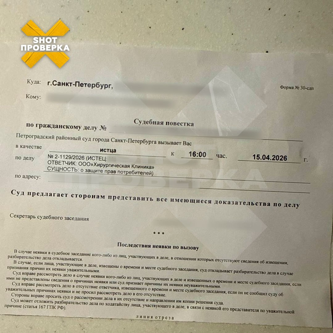 По данным SHOT ПРОВЕРКИ, 45-летняя Ойдыной обратилась в питерскую клинику Parada за небольшой коррекцией: хотела поправить грудь после нескольких лет с имплантами и заодно подтянуть лоб. Врач Руслан Алькема предложил провести операцию в два этапа — за 450 тысяч рублей. Сначала, по словам женщины, серьёзных проблем не было: форму скорректировали, импланты заменили. Но во время второго вмешательства, как она утверждает, хирург иссёк слишком большой объём тканей в попытке «сделать лучше». Это привело к сильному натяжению, венозному застою, воспалению и в итоге к некрозу тканей. Более того, по её словам, во время операции на голове рану зашили вместе с волосами — в результате там скопился гной.