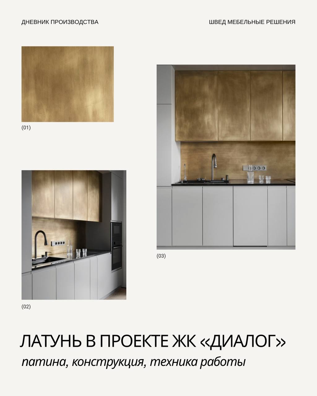 [ Материал ] Патинированная латунь — это латунь, у которой поверхность проходит контролируемое состаривание. Патина снимает «новизну», убирает блеск, делает металл теплым и глубоким по тону. [ Конструкция ] Чтобы лист лег ровно, без волн и напряжений, мы: — используем толщину 0,5 мм на фронтах и кромка 1 мм, — клеем на контактный клей, — собираем подложку так, чтобы латунь не тянула фронт — закрываем сверху лаком, чтобы в дальнейшем она не меняла свой цвет. Внутри все гораздо сложнее, чем выглядит снаружи: поддержки, крепежные узлы, конструкция торцов — это то, что позволяет большой латунной плоскости оставаться стабильной. Латунь — живой материал. И функциональный и эстетичный. Патинирование дает материалу эффект старины, а сама техника делает фасады практичными при ежедневной нагрузке.