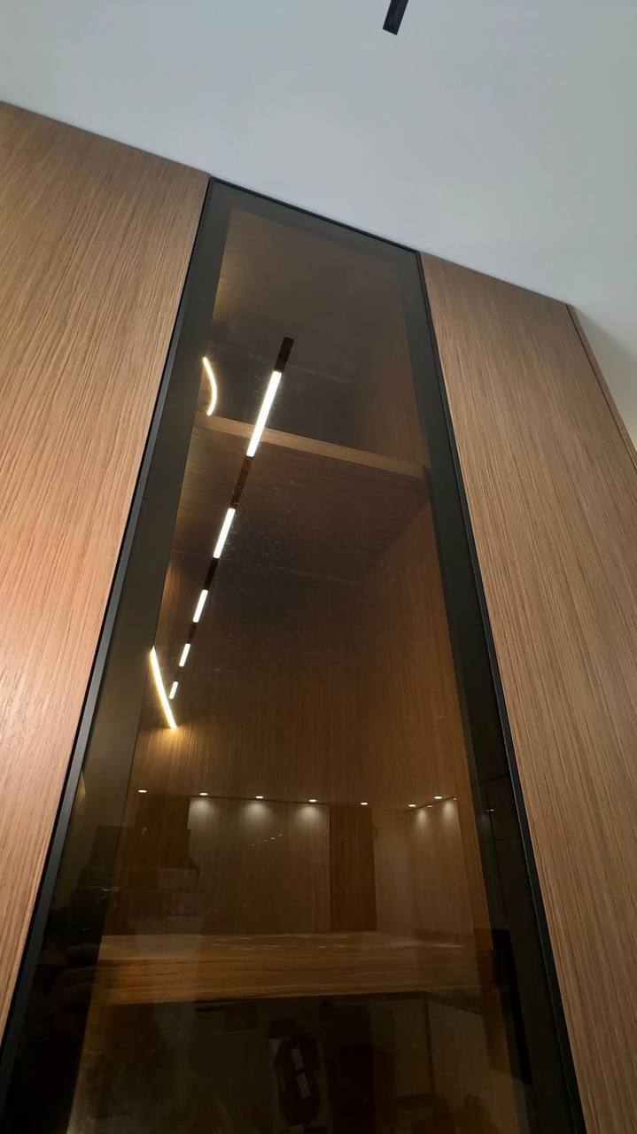 Отдельного внимания заслуживает декоративная панель с полками: полки «врезаются» в радиусную часть, подсветка интегрирована во врезной профиль и работает как мягкий контур.