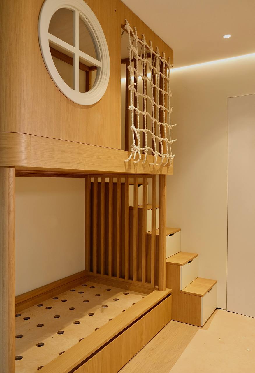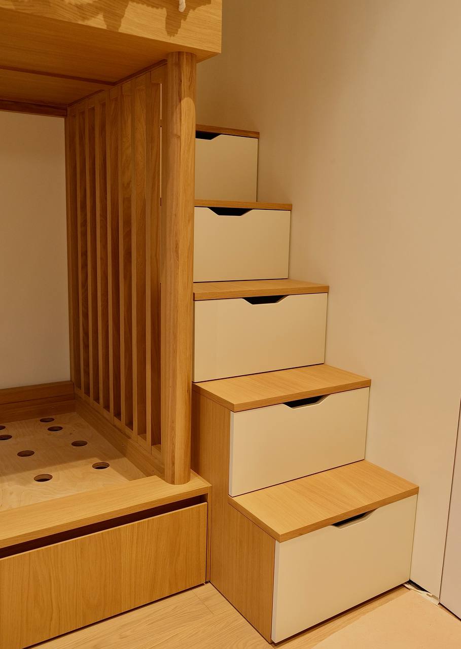На этапе проектирования [см чертежи] этой детской мы думали про стойки, радиусы, ящики, ограждения, а в голове все равно мелькали короткие сцены: как ребенок ищет свой маршрут, придумывает игру, осматривает пространство с той высоты, которая доступна только ему. В этот момент конструкция перестает быть обычным модулем, она начинает работать как часть жизни ребенка. Какая высота ему удобна, что он видит на своём уровне, куда тянется рука, где появляется ощущение «своего места». И все решения, которые вы видите в сборке, выросли именно из этого взгляда. Делимся с вами результатом. Дальше раскроем детали и решения, которые мы применяли под задачу.