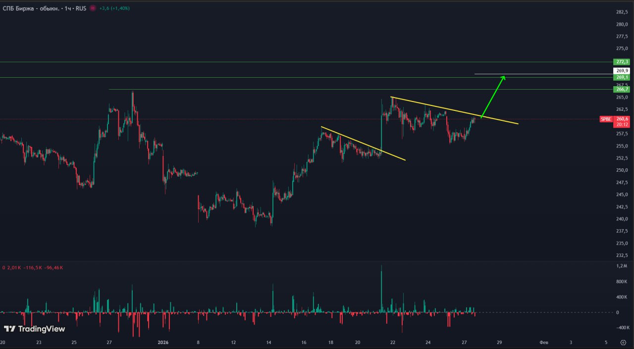 1h TF. SPBE находится в восходящем тренде. История показывает успешные прорывы на пробой наклонного уровня.