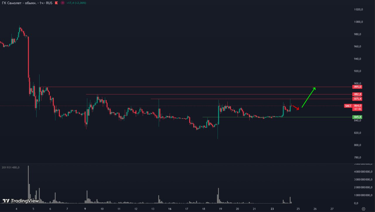 1h TF. SMLT движется вверх после падения и достиг зоны поддержки. Это видно по графику и объему, что свидетельствует о хорошей активности покупателей.