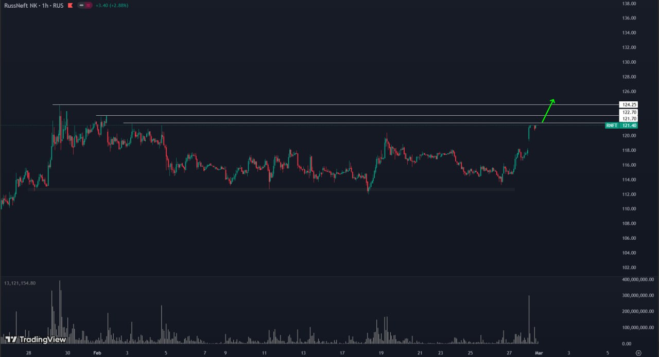 1h TF. На графике с временным интервалом 1 час (1H) видно, что акция находится в восходящем тренде. Это подтверждается тем, что минимумы не обновляются, что свидетельствует о продолжении роста.