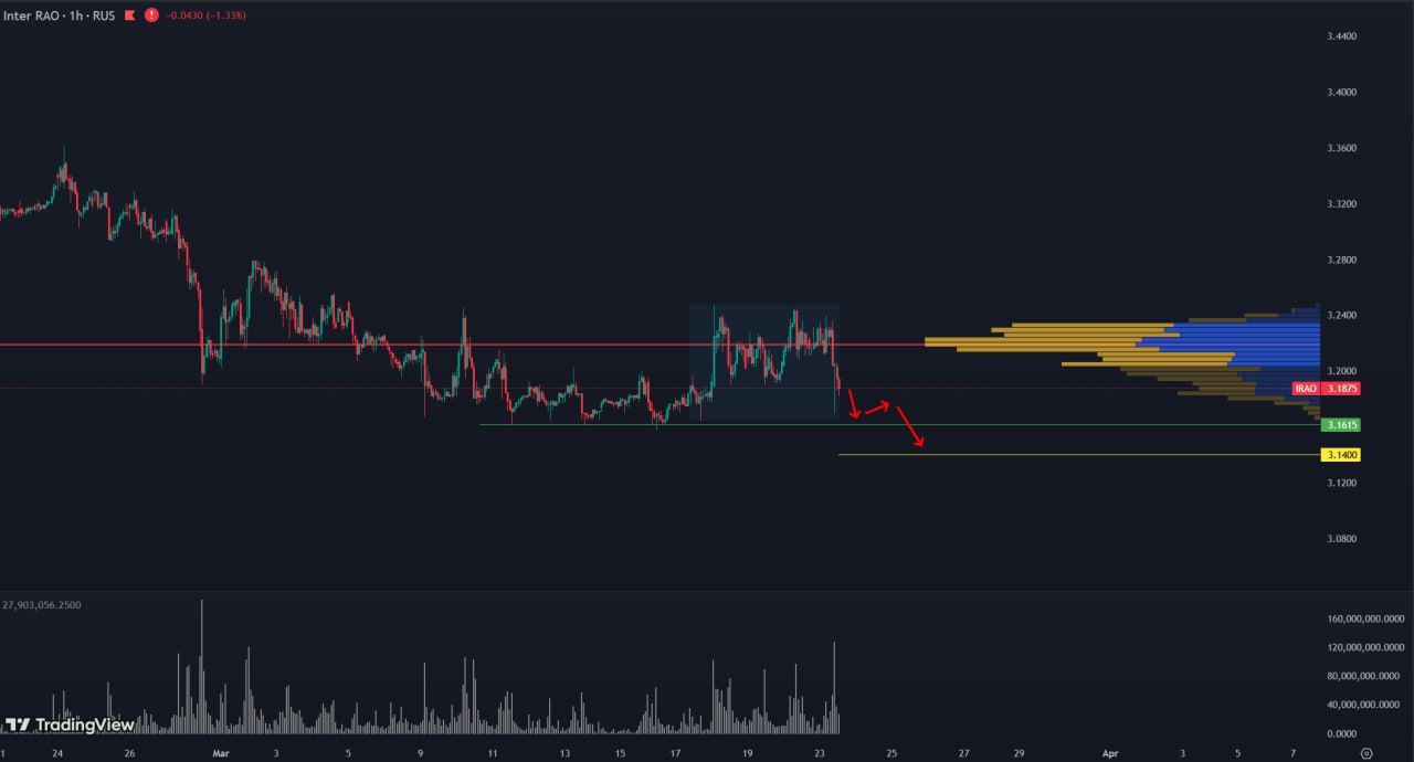 Ожидается пробой этого уровня и дальнейшее падение актива. Целевые уровни для движения — в районе 3.14.