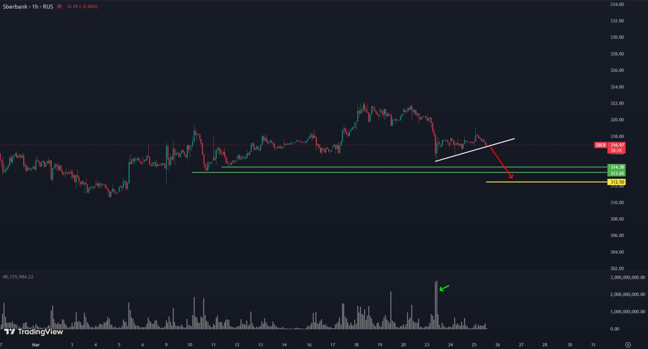 1h TF. Сбербанк: мы видим импульсное падение акций на больших объемах торгов. Цена немного откорректировалась и сейчас формирует наклонный уровень. Под текущей ценой находится каскад уровней, за которыми сосредоточена ликвидность участников рынка. Ожидается пробой этих уровней с дальнейшим снижением цены. Целевой уровень снижения – около 312.5.
