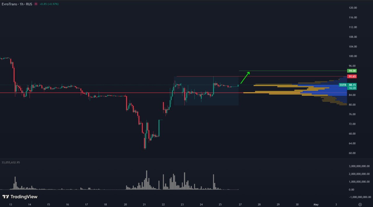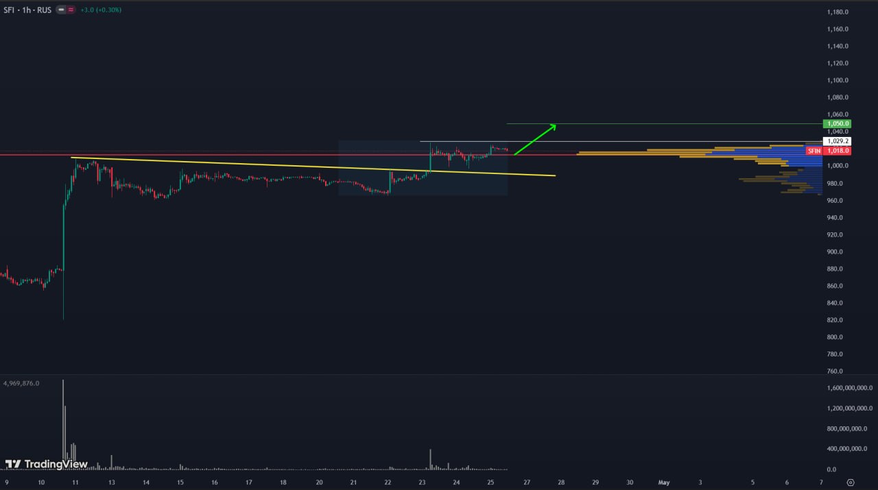 1H TF. Актив BANEP находится в восходящем тренде. Цена закрепилась выше уровня POC и поджимается к каскаду, что говорит о силе покупателей. Ожидаю импульсный пробой первых уровней, а затем движение выше. Цели в районе 1.050
