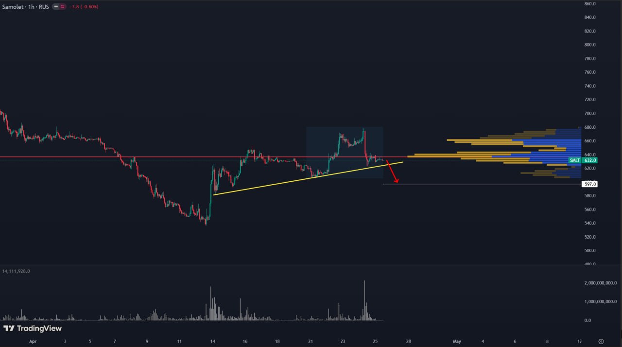 1H TF. Актив FIXR заколол локальные максимумы и вернулся к уровню поддержки за которым сосредоточена ликвидность участников. Цена закрепилась ниже уровня POC. Рынок негативный, топы падают. Ожидаю небольшой отскок, а затем продолжение падения. Цели в районе 0.658
