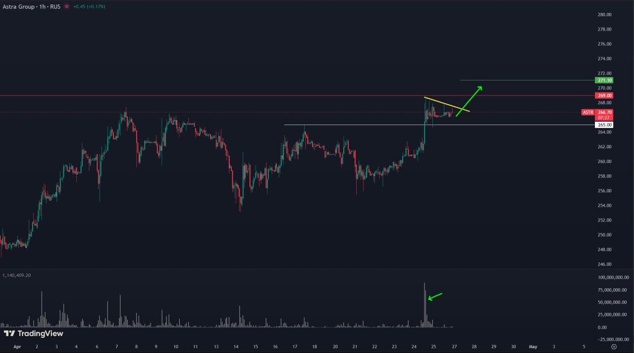 1H TF. Актив MSRS находится в восходящем движении и держится сильнее рынка. Цена импульсно выросла на объемах и закрепилась выше уровня POC. Наблюдаем поджатие к наклонному уровню. Ожидаю пробой, а затем продолжение движения выше. Цели в районе 2.2