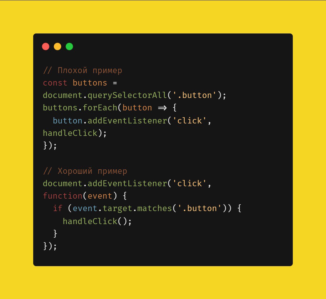 Делегирование событий позволяет обрабатывать события на родительском элементе, что уменьшает количество слушателей и улучшает производительность.