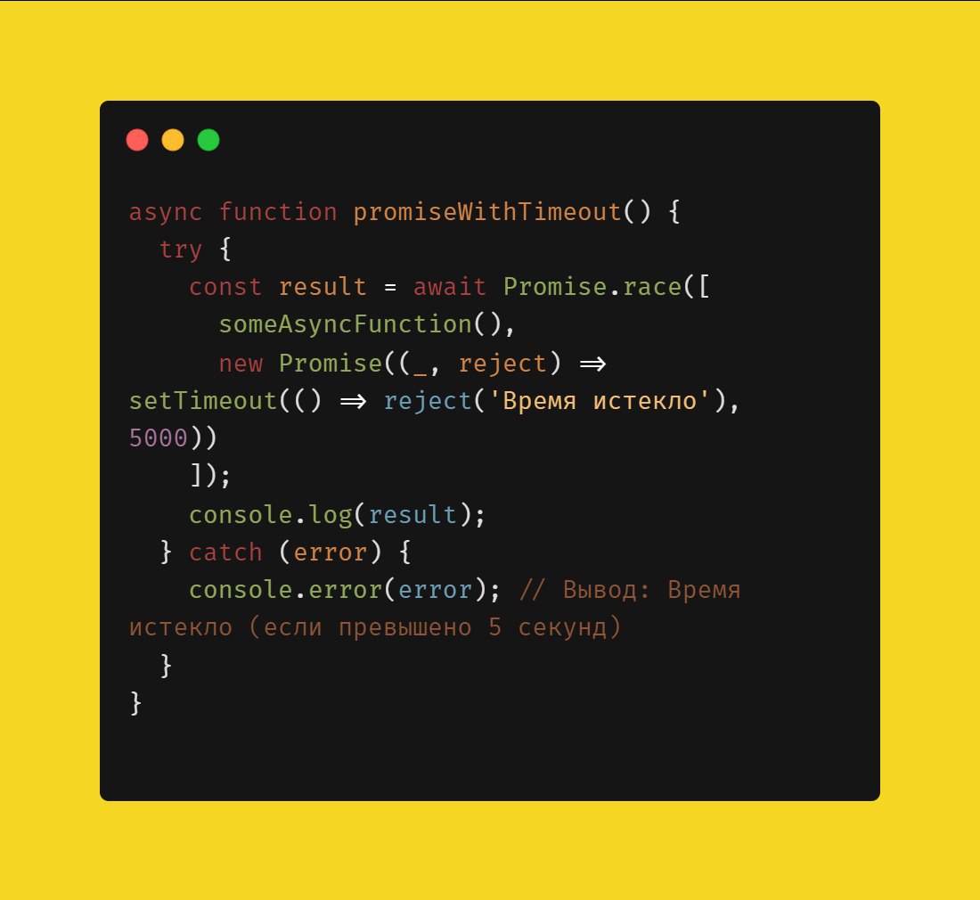 Ожидание выполнения промиса с таймаутом Promise.race ожидает первого выполненного промиса и может использоваться для установки временного ограничения. #промисы