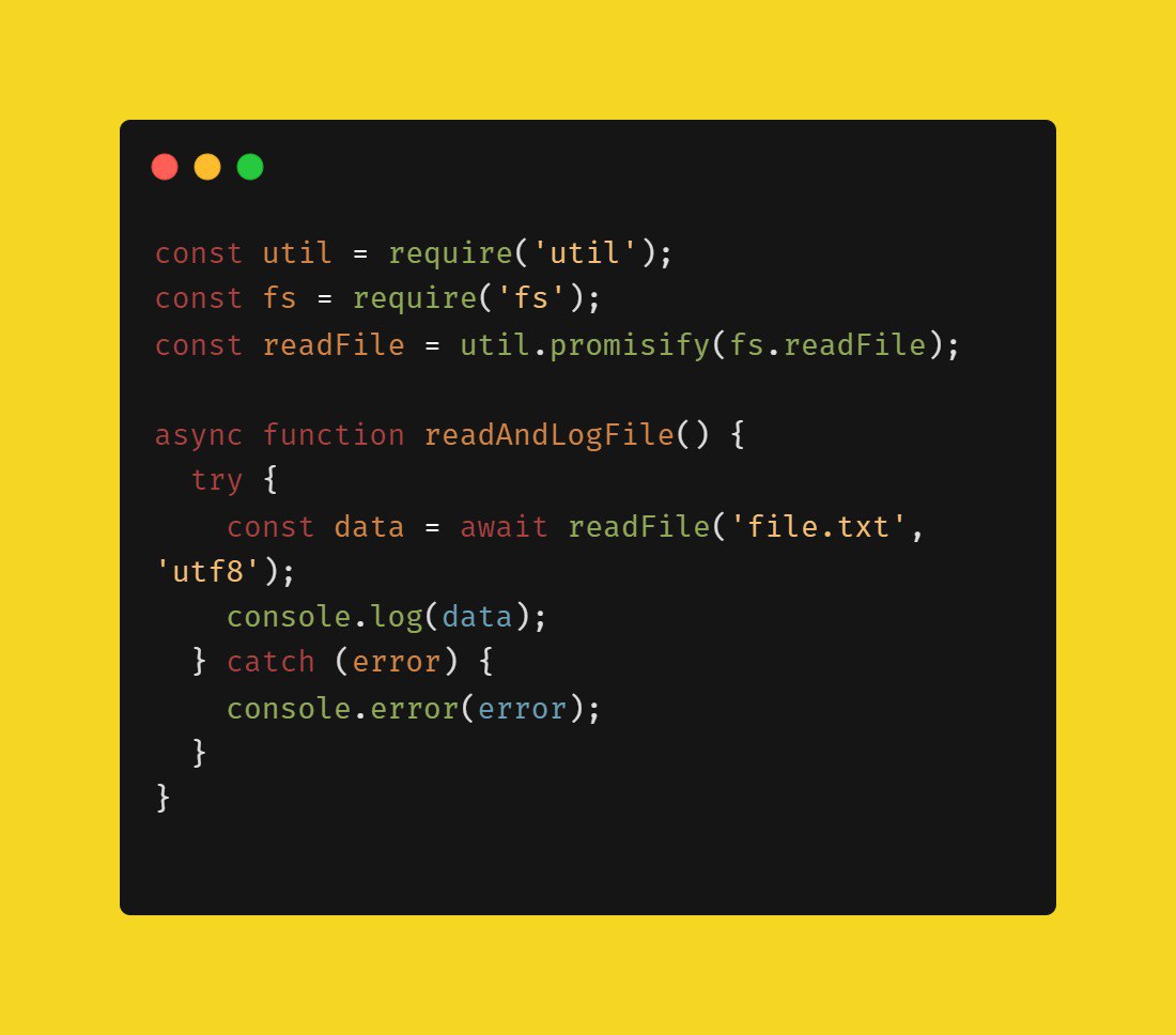 Преобразование колбэка в промис с util.promisify util.promisify преобразует асинхронную функцию использующую колбэк, в промис, что делает ее удобной для использования с async/await. #промисы