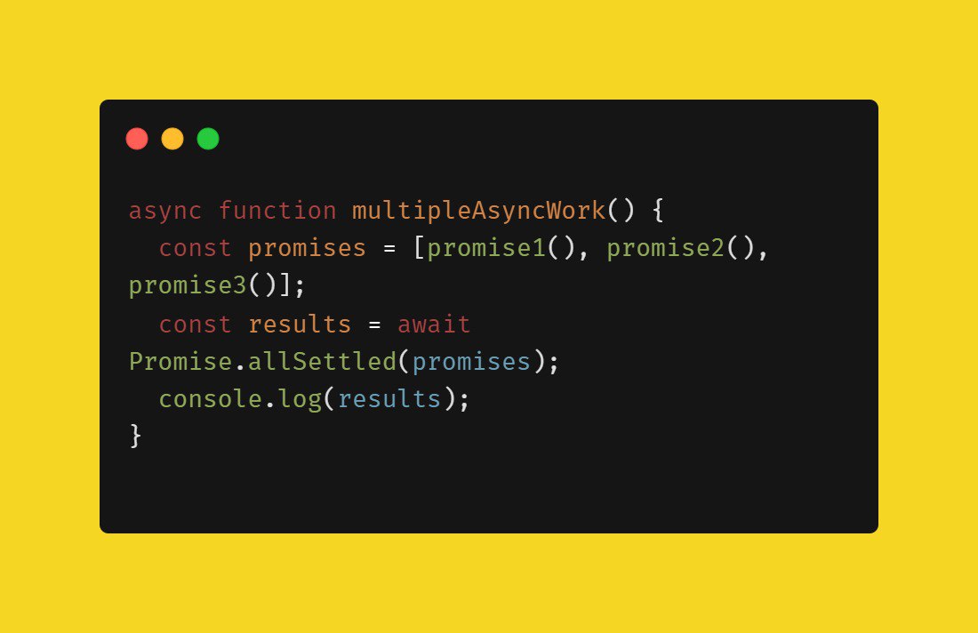 Ожидание выполнения нескольких промисов с Promise.allSettled Promise.allSettled ожидает завершения всех промисов и возвращает их состояния (успешно или с ошибкой) и результаты. #промисы
