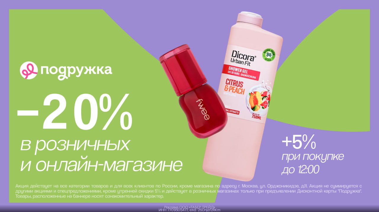 💄 Скидка 20% + 5% утренняя скидка = 25% выгоды в Подружке