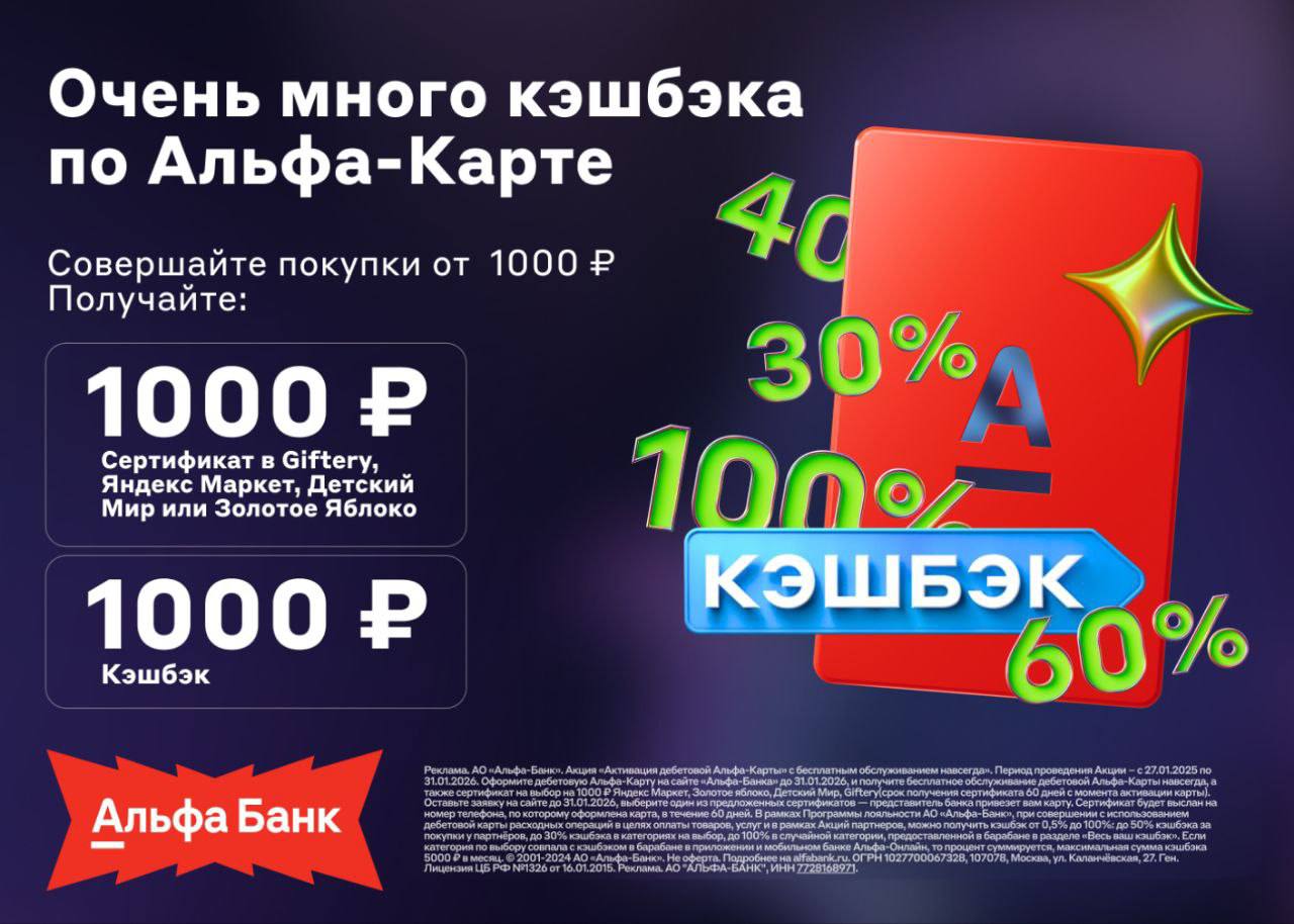 Получите кэшбэк 1 000 ₽ и сертификат на 1 000 ₽ на выбор (в Giftery, Детский мир, Яндекс Маркет, Золотое Яблоко). Продолжайте пользоваться картой и получайте кэшбэк до 50% у партнёров без лимита по сумме.