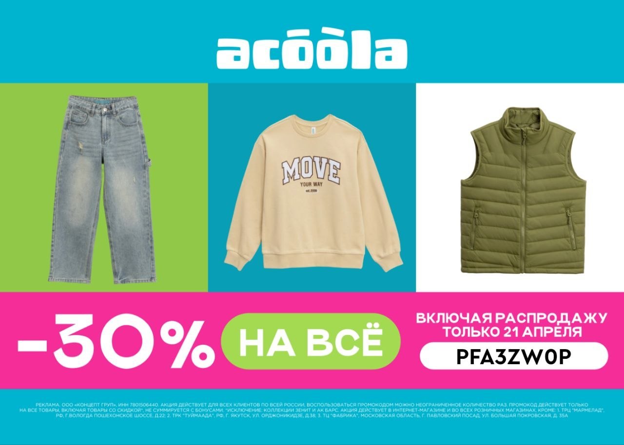Дополнительная скидка -30% на детскую одежду в интернет-магазине ACOOLA 👚👢