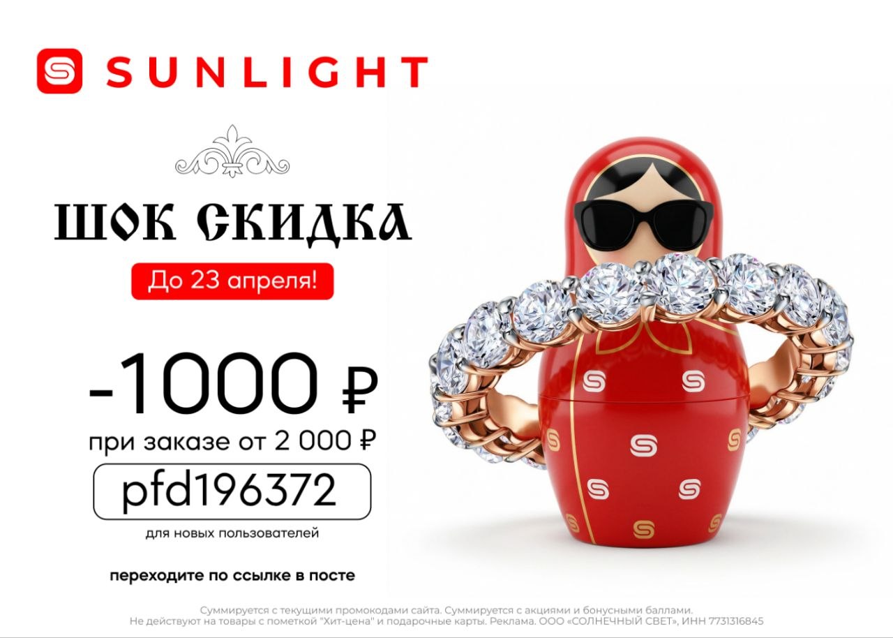 *Акция действует для всех клиентов по всей России, воспользоваться промокодом можно неограниченное количество раз. Промокод действует на все товары, включая товары со скидкой**, не суммируется с бонусами.