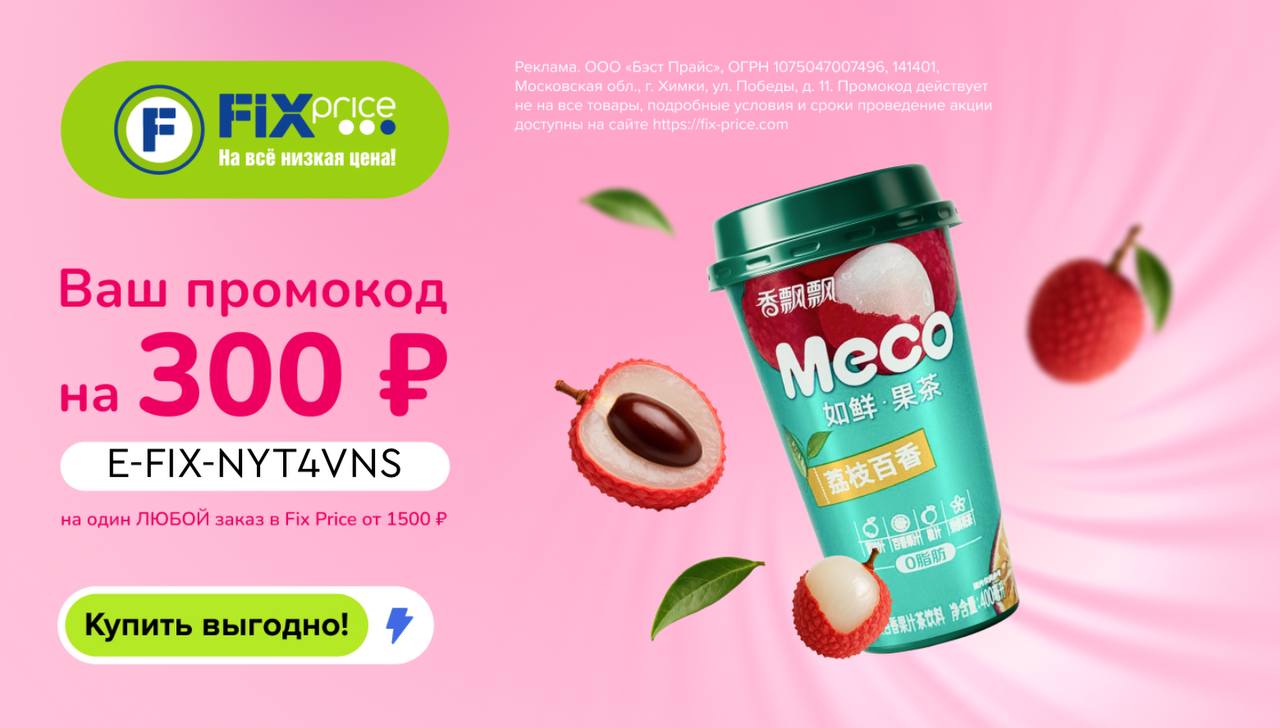 Реклама. ООО «Бэст Прайс», ОГРН 1075047007496, 141401, Московская обл., г. Химки, ул. Победы, д. 11. Промокод действует не на все товары и заказы, подробные условия и сроки проведение акции доступны на сайте https://fix-price.com/
