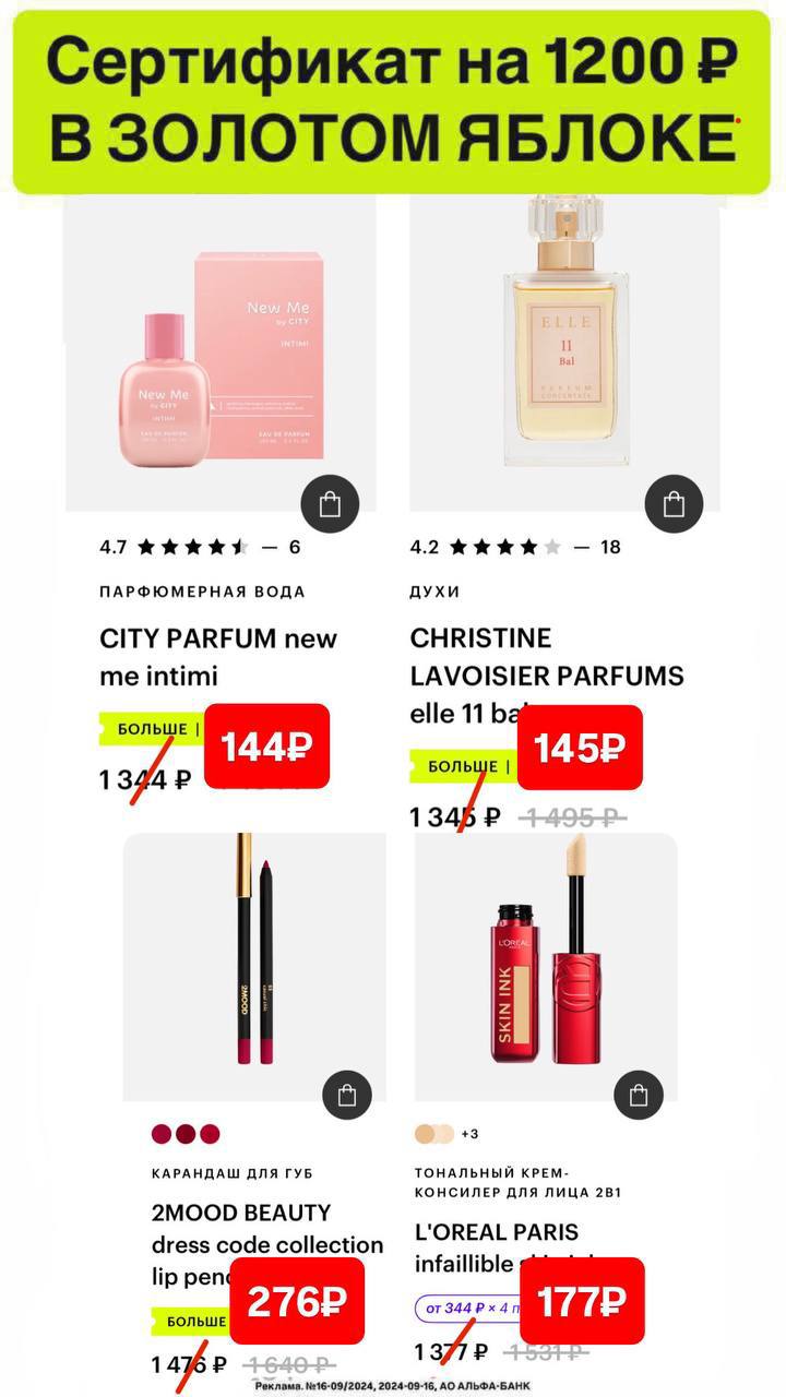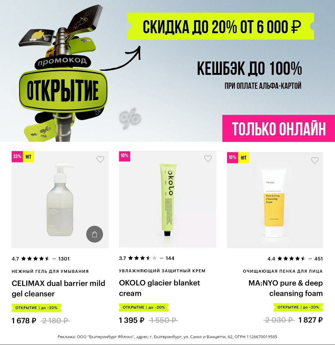 Промокод действует только для авторизованных пользователей, не суммируется со скидками выше −40%, акциями 3=2, 2=1 и подарками при покупке, не действует при покупке пластиковых подарочных карт и электронных подарочных карт Золотое Яблоко