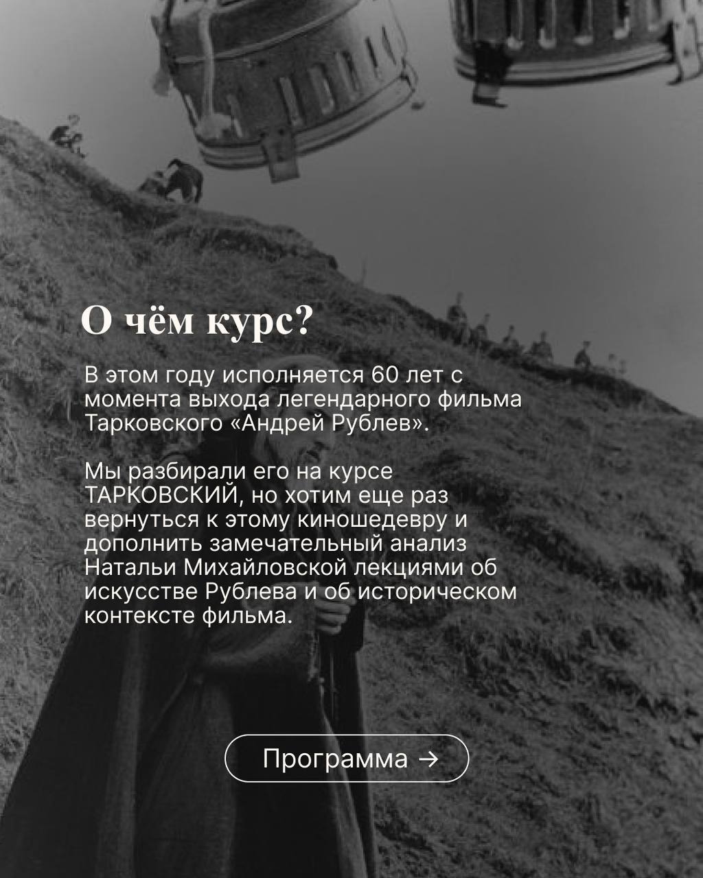 В этом году исполняется 60 лет с момента выхода фильма «Андрей Рублев». Мы смотрели его в рамках курса ТАРКОВСКИЙ. Но подумали, что будет здорово к нему еще раз вернуться и немного расширить тему: помимо лекции с разбором фильма мы еще поговорим о фигуре самого Рублева и его искусстве, а также об исторических событиях, происходящих в фильме.