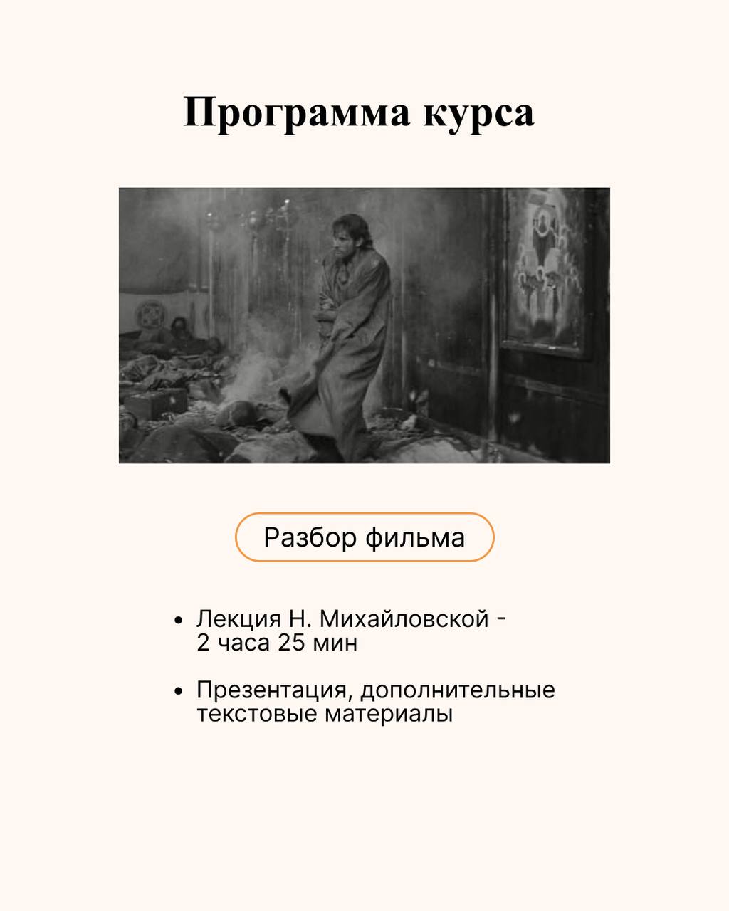 Для тех, кто не был на курсе ТАРКОВСКИЙ - это прекрасная возможность посмотреть лекции об одном фильме (обычно мы не разбиваем этот курс). А для тех, кто на «Тарковском» был, новый курс - возможность углубить свои знания.