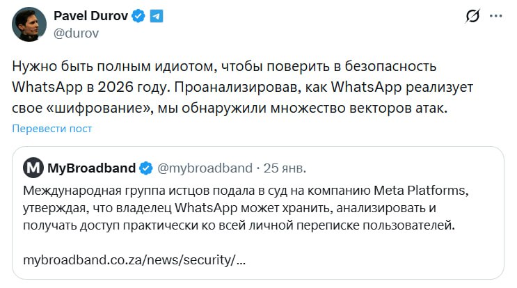 «Нужно быть полным идиотом, чтобы верить в безопасность WhatsApp* в 2026 году», — Дуров раскритиковал мессенджер за шифрование данных.