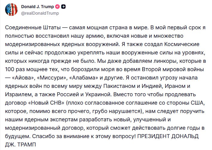 «Вместо того чтобы продлевать договор «Новый СНВ» (плохо согласованное соглашение со стороны США, которое, помимо всего прочего, грубо нарушается), нам следует поручить нашим ядерным экспертам разработать новый, улучшенный и модернизированный договор, который сможет действовать долгие годы в будущем».