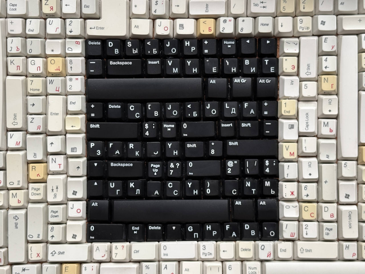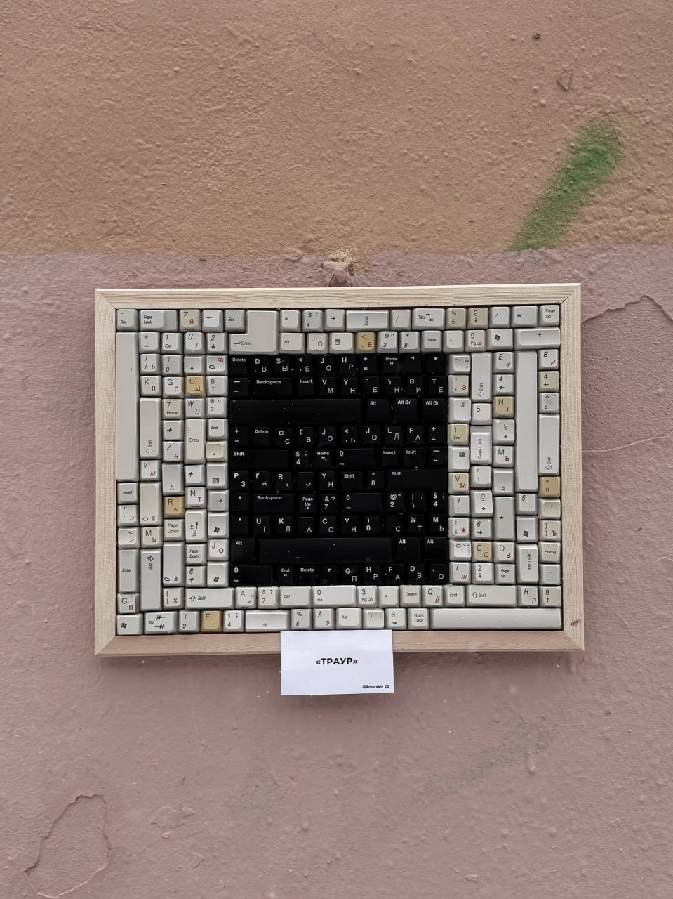 Пока российские власти готовятся заблокировать Telegram, назначают уголовные сроки за комментарии в соцсетях и закрывают доступ к западным сервисам, петербургский художник Руслан Амурский ответил на это новой работой. На улице Достоевского, 24/9, появился арт-объект «Траур» — квадрат из старых компьютерных клавиш, где чёрные клавиши складываются в слова «Свобода», «Гласность», «Закон», «Мнение», «Выбор», «Право», а вокруг них хаотично разбросаны белые.