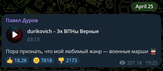 Создатель Telegram опубликовал в своем русскоязычном канале очередную композицию, созданную с помощью нейросетей. Трек под названием «Эх, ВПНы верные» выполнен в стилистике марша.