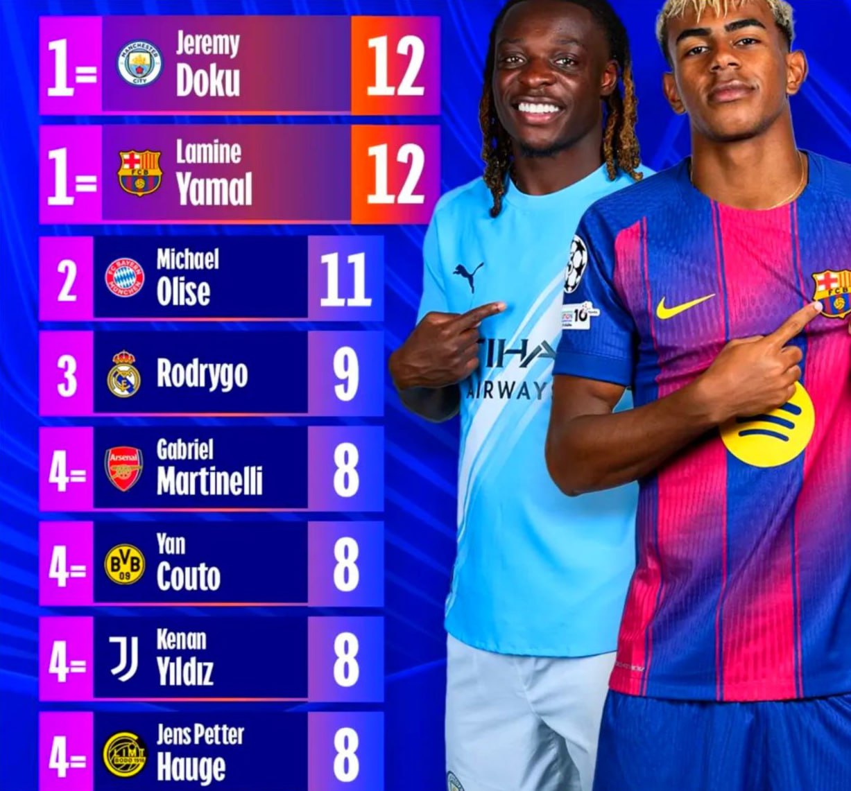 📊 Лучшие дриблёры ЛЧ в этом сезоне. 😎 @lamineyamal