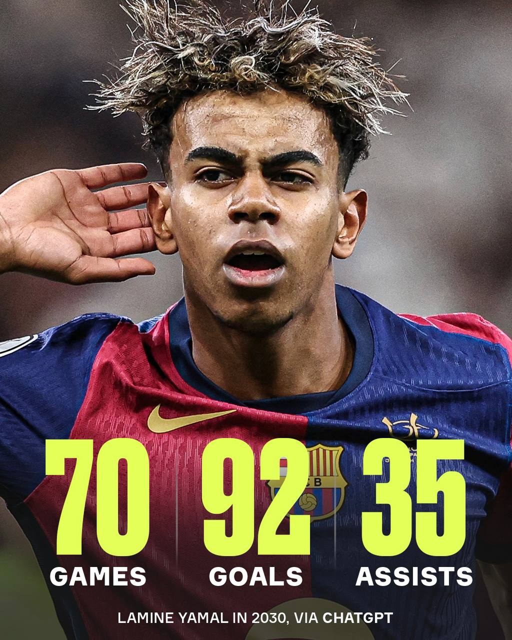 📊 ChatGPT прогнозирует, что Ламин Ямал побьет легендарный рекорд Лионеля Месси по количеству голов за один календарный год (91 гол) к 2030 году. 😎 @lamineyamal