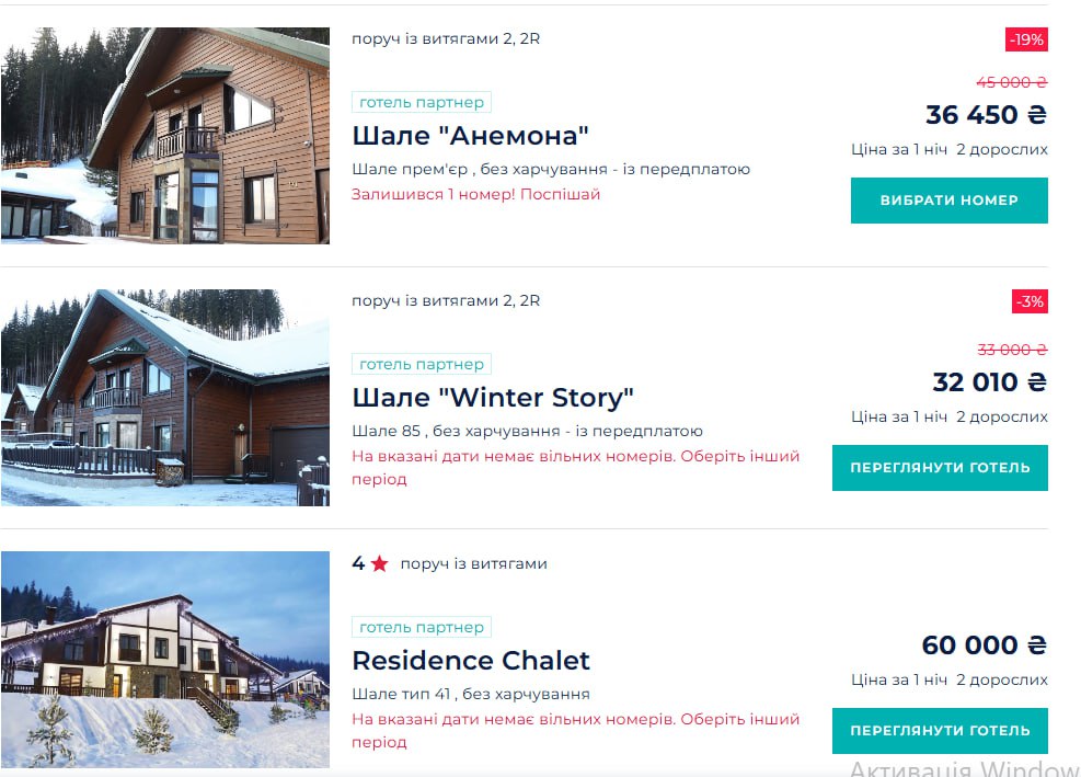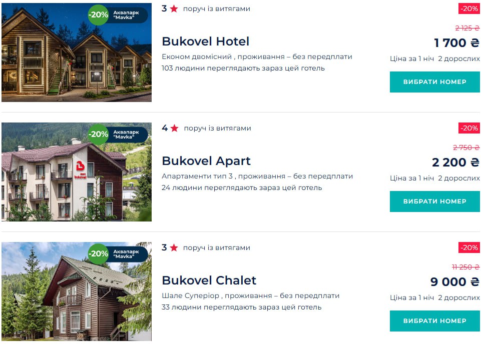 Например, в Буковеле и соседней Полянице цены в среднем от 2 125 грн в сутки за стандартный номер, улучшенный номер - от 3 000, номер в спа-отеле - от 4 500 грн, цены в люксах – до 10 тысяч грн.