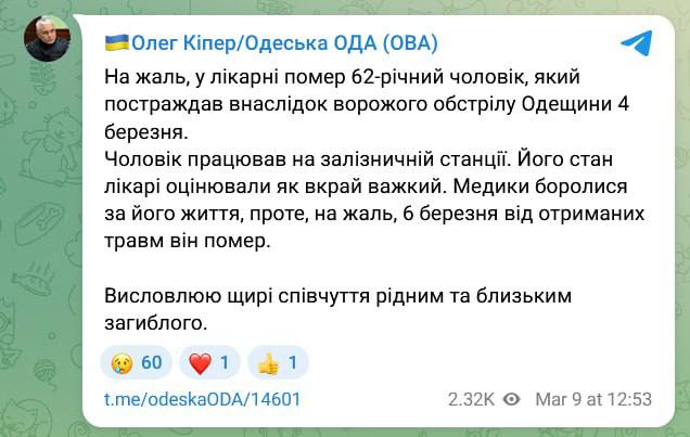 ✔️В больнице скончался 62-летний мужчина, пострадавший от обстрела Одесщины 4 марта — ОВА.