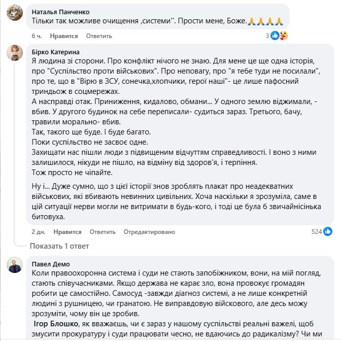 В ответ посыпалась куча комментариев. Но если вы думаете, что их авторы в глубоком шоке, то нет. Посыл примерно такой: "Собаке собачья смерть. Никто не имеет права обижать военных, распустились тут!.."