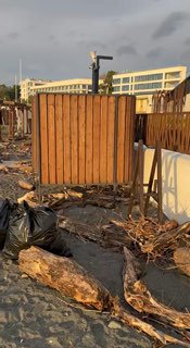 Часть пляжа смыта и отрезана, подмыты габион и спортивная площадка.
