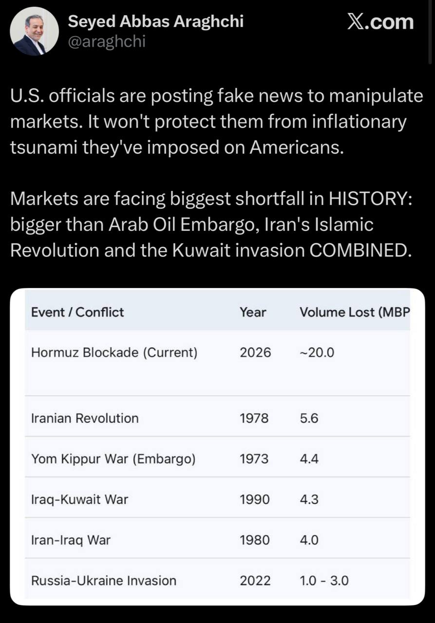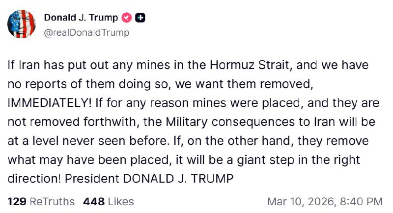 «Если по какой-либо причине мины были размещены, и они не будут убраны незамедлительно, военные последствия для Ирана будут на беспрецедентном уровне. С другой стороны, если они уберут то, что, возможно, было размещено, это будет гигантским шагом в правильном направлении!»