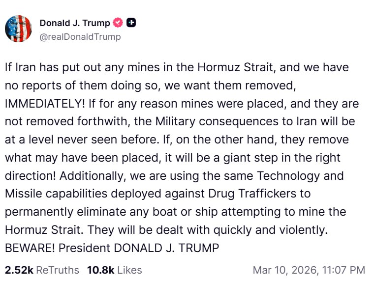📸 «Если Иран разместит какие-либо мины в Ормузском проливе, а у нас нет сообщений о том, что они это сделали, мы хотим, чтобы они были немедленно убраны!», – Дональд Трамп отреагировал угрозами на сообщение о том, что Иран якобы начал минировать Ормузский пролив.