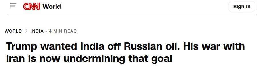 Американский телеканал сообщает, что многомесячные усилия Вашингтона по сокращению закупок Индией российской нефти потерпели крах. Причиной стала совместная военная операция США и Израиля против Ирана, которая фактически заблокировала Ормузский пролив.