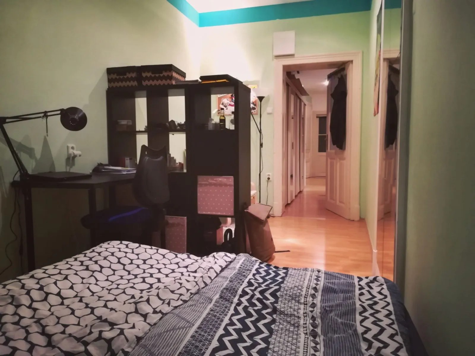 Комната просторная и меблирована, мебель нужно будет приобрести за символическую цену (кровать, прикроватный столик, книжный шкаф, вешалка для одежды, ковер). Кроме того, в комнате есть один большой шкаф в коридоре.