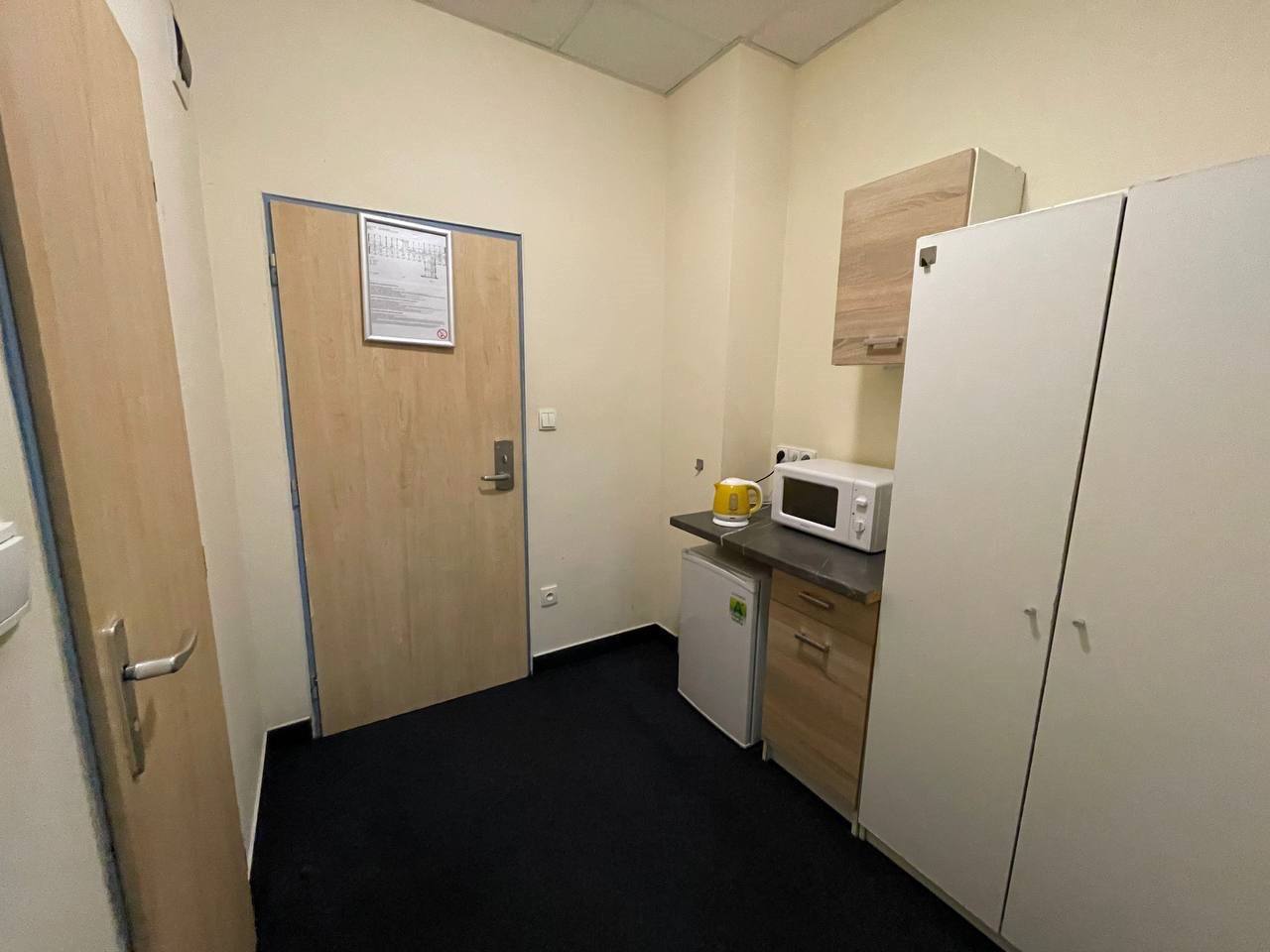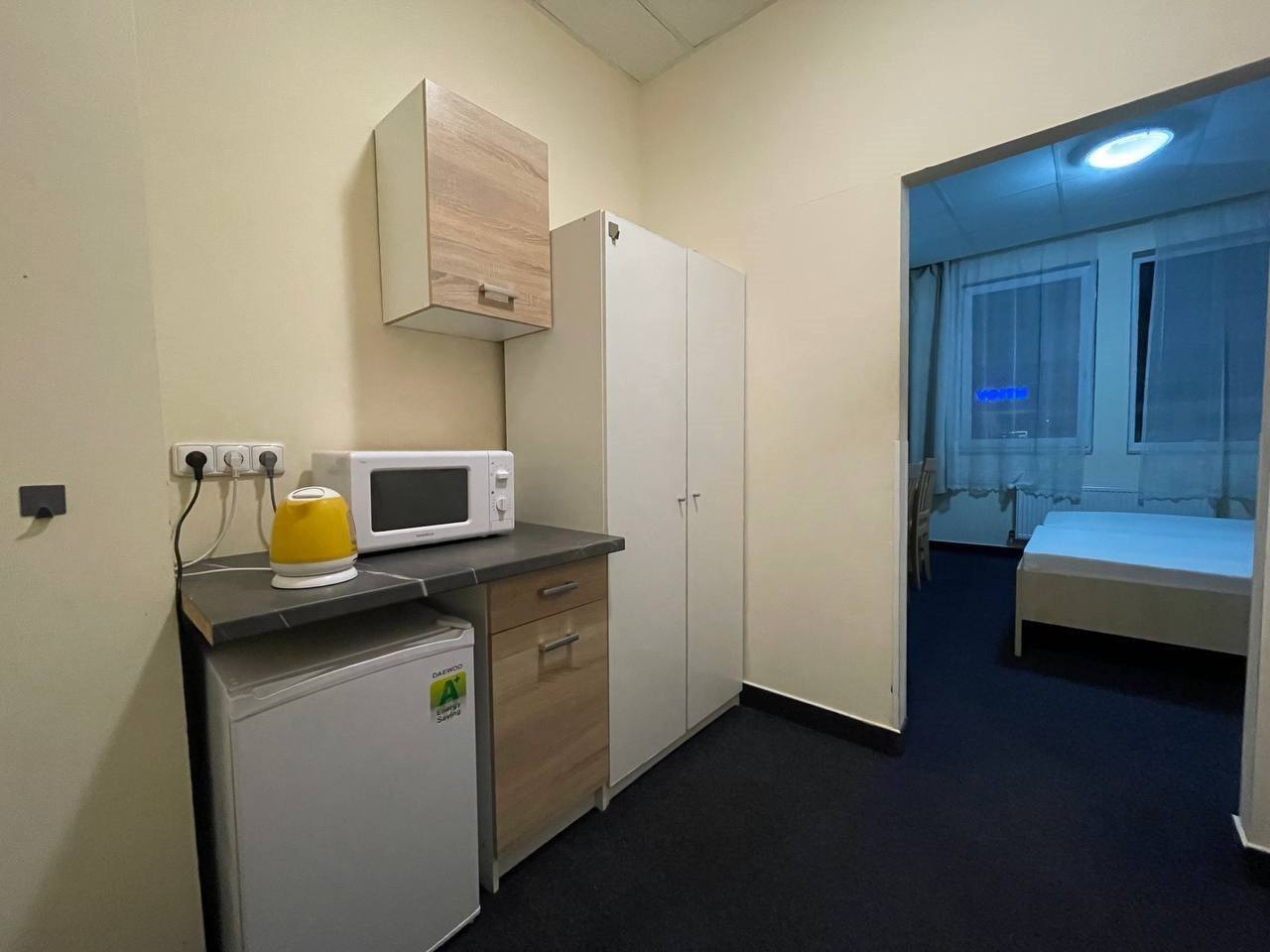 Свой душ и туалет, холодильник, микроволновка, чайник, телевизор, шкафы, стол, тумбочки.
