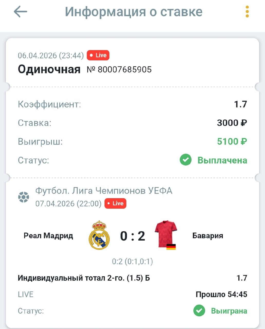 Статистика поединков немецкого клуба на чужих полях впечатляет: мюнхенцы забивали минимум 2 гола в 7 из последних 8 гостевых матчей ЛЧ. На фоне того, что «Реал» дома почти неизбежно допускает моменты у своих ворот (плюс не сыграет Тибо Куртуа), а сами мадридцы играют смело и редко закрываются, атакующий потенциал «Баварии» и ее умение забивать минимум дважды даже на выезде выглядят весомым аргументом в пользу результативности гостей на «Сантьяго Бернабеу».