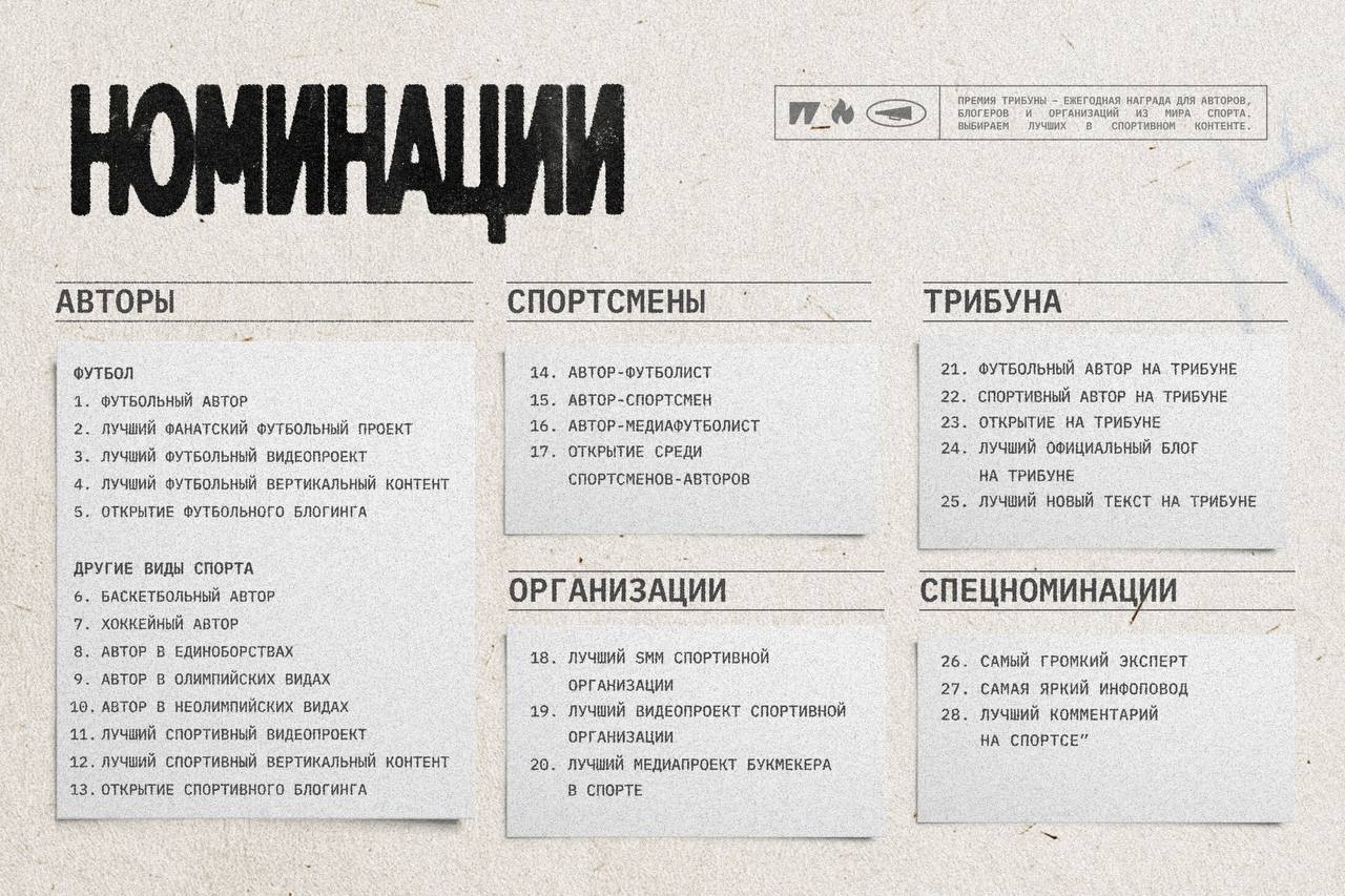 А вот на Спортсе запускаем максимально независимую: премию Трибуны. Фестиваль для авторов, проектов и команд, которые формируют спортивное инфополе. Будут охвачены разные площадки: Трибуна, ютубчик, телега, вертикальные видео, клубные медиа и все-все соцсети.