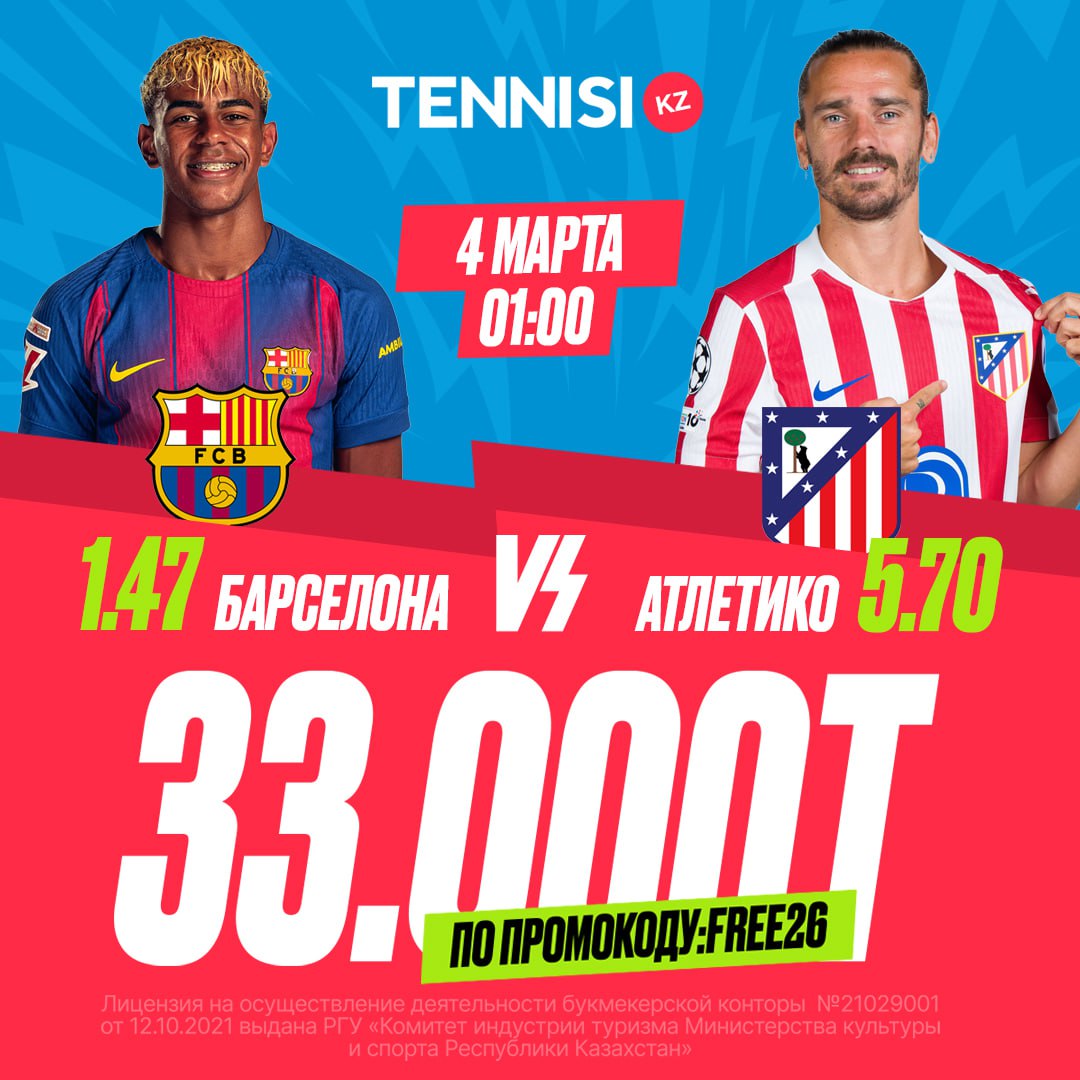 💶 Стартовать в Tennisi.kz вы можете с приветственным бонусом до 33 000 тенге по промокоду FREE26. Первый фрибет упадет сразу после регистрации👇