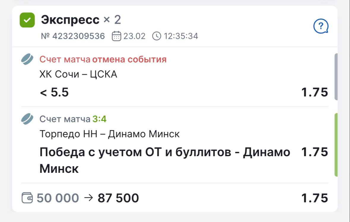 Как итог - матч сначала перенесли на полтора часа и один период матча, после игра была остановлена. Шайб реализовано не было и можно было расчитывать на зачет ТМ от БК, но нет.